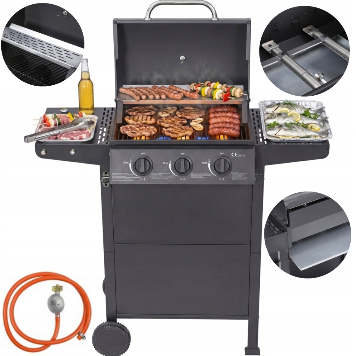 Trzy palniki ze stali nierdzewnej do wydajnego grillowania bezpośredniego i pośredniego